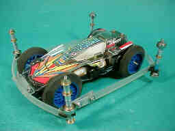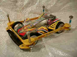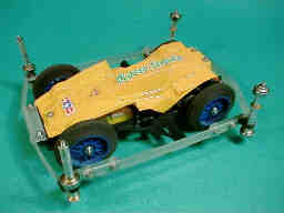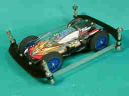 VS−1弱点を補強した、レース用マシンです。 ナロートレッドの薄型大径タイヤと、サイドバンパーが特徴です。 前後のバンパーをサイドバンパーで連結し、剛性が高くなっています。 |