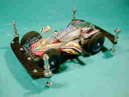 VSシャーシの評価用に作ったマシンです。 薄型大径タイヤと、シンプルなカーボンバンパーが特徴です。 前後のバンパーが分離しているので、剛性が低い事が難点です。 ミニテンの月例レースで予選首位でしたが、案の定シャーシが軟化し、本選で入賞を果たすことができませんでした。 |