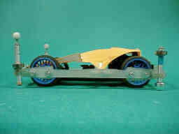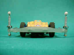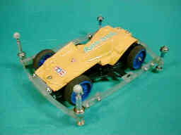 無駄の少ない完成度の高いマシンです。 垂直材を湾曲させる事で、水平材の使用量を極端に減らして軽量化し、同時に、左右独立可変スラスト機構を前後全てのローラーに装備したマシンです。 この機構によって、フラットコースにも、ブリッジコースにも即座に理想的な対応が出来ます。 99年6月、7月とミニヨン天国のレースを連覇 −−−−−−−−−−−−−−−−−−−−−−−− タイムアタックは、テクニカルコースで行われた為に、安定走行が可能な28ミリタイヤを装着し、トーナメントは狼のループチェンジャーによるフラットなコースであった為に、速度の出る35ミリタイヤを使用しました コースの状況が変化しても、4ローラー可変スラスト機構で柔軟に対応出来、それ が、好結果をもたらす事が証明されました。 この優勝には、本マシンの性能だけではなく、黎明計画の為に開発された新型 充電器(RMX174充電装置)の性能が大きく寄与しています。 |