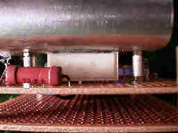 本機は、帰還制御で精密に温度を管理し、30°から100°の範囲で電池を加熱します。 画面左部が電池加熱部で、中央部に制御回路を設けています。黒く見える部品は、制御トランジスタの放熱器です。 |