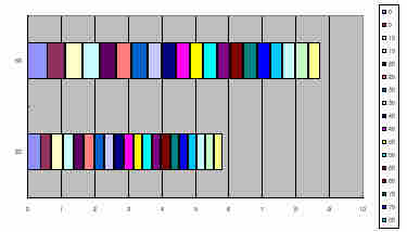 同じ負荷で電池を放電させ、5秒毎に取り出せたエネルギーを示します。 上が50℃、下が20℃の場合です。温度を上げると取り出せるエネルギーが増えています。 |