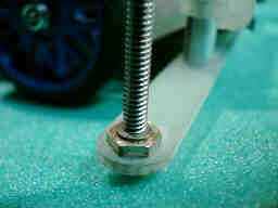 最初に、下バンパーに、段を付けたナットを締め付けます。通常のナットと、段付きワッシャでも良いですが、バンパーからローラーまでの間隔を狭くしたいので、この方法にしています。