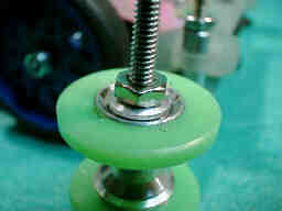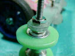 上下、何れか一方のパンパーでだけで支持すると、フェンスとの衝突で心棒の2ミリビスが曲がります。その結果、@回転の抵抗が増す、Aスラストが狂う、といった問題が発生します。そこで、ローラーを上下のFRPバンパーで挟むように取付けています。 また、説明書には、直径の大きい方を下にして取り付けるよう書かれていますが、その逆に取り付けた方が、安定するようです。