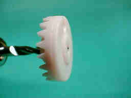 ギアの一方から、ドリルの先端が、ギアの端面と一致する(左写真参照)ところ迄、2ミリのドリルで、穴を開けます。空けた部分は丸穴、空け残った部分が6角穴、となります。 六角の部分は僅かなので、過度のトルクが加わると変形して、滑りを生じます。 |