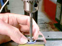 ベアリングを外した穴に、5ミリのハンドリーマーを垂直に通して、穴を仕上げます。垂直に加工する為に、ボール盤にリーマを咥えていますが、決して電気では回転させません。油を塗って手でゆっくりと回転させます。