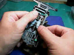 圧入しながら、時々シャーシに合わせてみて、長さ方向のガタをチェックします。紙一枚分のガタがある状態に圧入します。
