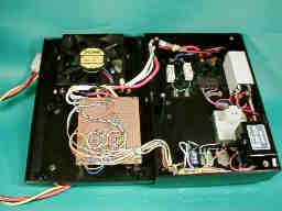 左上に見えるのがファンです。その下に制御基板があります。右上がタイマー、右下が電子ブザーです。 |