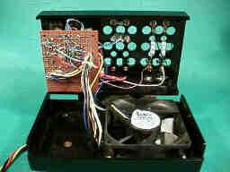 ケース内には、電池と放熱板を冷却するファンが見えます。ファンはデジットで、380円の出物です。 回路はユニバーサル基板を使用して配線しています。 電源は、制御用に12V100mAと充電用に5V10Aを使用しますから、DOS/Vの電源が最適です。 回路は、4069UBPをアナログ利用しており、安価で安定な動作を実現しています。 大電流のパルスを扱いますから、発振対策等の基礎的な配線技術が必要です。 |
