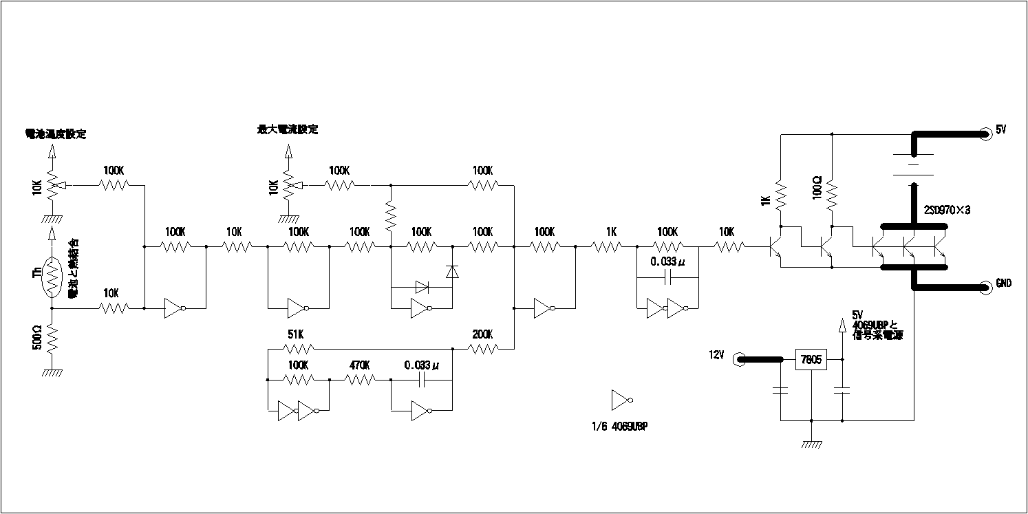 本充電装置の回路図です。充電系の5Vとは別に3端子で作った安定した5Vを使用 しています。アースの取り回しが悪いと、容易に発振します。