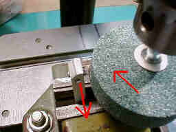 離れて見ると左の様になります。プロクソンのフライス盤(安いですよ)に、マシンバイスを取り付けて使用しています。 砥石は、GC材(緑色)が望ましいです。WA材(橙色)だと、ステンレスナットを使った場合等は食いつきが悪いです。 |