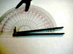 2枚のFRPバーの角度を分度器で調べます。 一度確認すれば、その治具のセッティングで研削すれば、同じ角度のナットがいくつでも作れます。 |