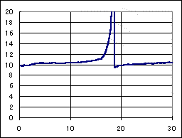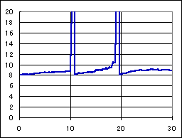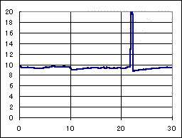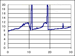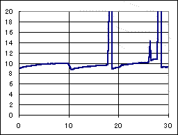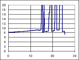 全然駄目だった、ドクのマシン。アトミックモーター、超速ギア、大々径タイヤの組み合わせで前半好調であったが、後半コースアウトを繰り返し、リタイアした。 2段アルミローラーを使用した4ローラーのマシンであるが、やはり高い位置にもローラーが無くては高速安定性の確保は難しい様だ。 二段アルミローラーのフランジを、スパーギアを削った樹脂でプラリング化している細工が怪しい。 速度変動には、パルス充電器の特徴が出ており、最初のピークが公称電圧に落ちる迄の時間が長く、なだらかになっている。 |