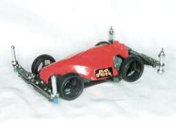 アトミックモータ、超速ギア、大径タイヤの組み合わせで、スピード部門3位に入賞したマシン。 19ミリプラリングローラーの採用で速度を伸ばした。ステアリングユニットの装備にも注目したい。 速度の安定度がずば抜けているので、抵抗も少なく、セッティング次第で、更に上位を狙えるマシンと思われる。 |