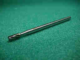 頑丈さと切れ味を追求するならやはりエンドミルです。しかし、一般のエンドミルは良いものでも、コバルトハイスなので、FRPを切ると10センチ切る毎に砥ぐ必要があります。 写真は超硬ソリッドエンドミルで、リングバンパーを5枚くらいは切り出せます。各社が発売していますが、これは、ナチの商品です。 太さは0.1ミリからありますが、実用的なのは2〜3ミリだと思います。へたっても再研削出来ます。4000円くらいで、大型工具店で売られています。 |