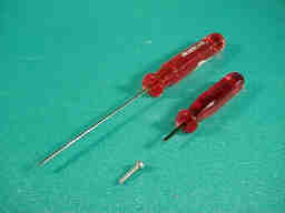 キャップドボルトを使うと、ネジの頭がバカになりにくく、安心してネジ止めが出来ます。 写真はその為のドライバーで、左がスイスPB社の商品でボールポイントになっています。右はミニ四駆用に短く切って作ったものです。 |