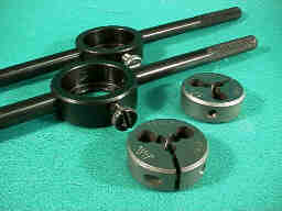 シャフトにネジを切る等、ダイスがあると便利です。ダイスはハンドルを2本用意して、古いもので下ネジを立てて、新しいもので、仕上げをすると、作業が早く、長持ちします。ハンドルは300程度と安価です。 ダイスは刃に付いている調節ネジで、ダイスの締まりの限界を設定し、ハンドルに付いているネジで、締め付ける力を加減するしくみになっています。 ステンレス等にネジを切る場合は、ハンドルのネジを半回転程度ゆるめて、次第に絞めながら3回程度に分けて切ると、刃が傷みません。 |
