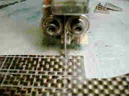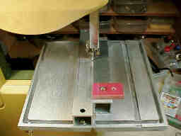 写真に見える鋸刃ガイドのベアリング3個を正しく調整し、進行方向に軽く押すと調子良く切れます。バンパー程度ならアッと言うまに作れます。 通常の鋸歯と取り替えて一般工作にも使えて便利です。軟鋼なら、15ミリ、真鍮なら30ミリくらいの棒まで切れます。 フリーハンドでは直線が正確に切れませんので、下に説明する直線切りアダプタを自作して使用しています。 |