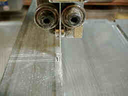 25ミリのアルミ角棒に刃の入る溝を切ってテーブルにネジ止めしています。 |