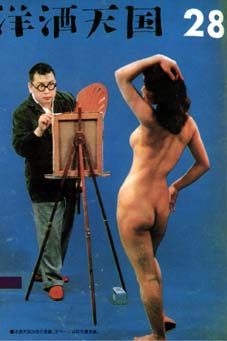伏見風工房様からは、さらに、当時の雰囲気の伝わる情報を頂きました。 当時、サントリーから出ていた洋酒天国という小雑誌の写真です。 表紙にヌードが使われ、当時は衝撃的だったそうです。裏表紙を見ると、実は、ラフをスケッチしているのではなくて、洋酒の絵を書いていた、という洒落まであって、とても楽しい作りです。現在より余程上品で文化的ですね。男性は若き日の開高健ではないか?(名優・太宰久雄に間違いない!、というお便りも別途頂いております)との事です。 |