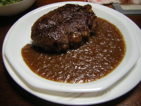 ソースの材料が混じってソースとなります。 ソース全体が激しく沸騰しはじめて10秒程混ぜ続ければ できあがりです。これを、肉の横に流して供します。 |