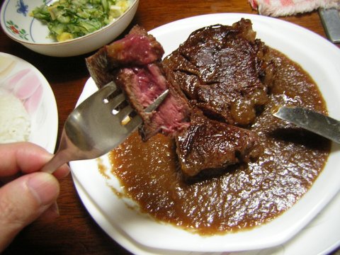 硬い(安い)肩肉のステーキ(350gステーキが310円で!) |