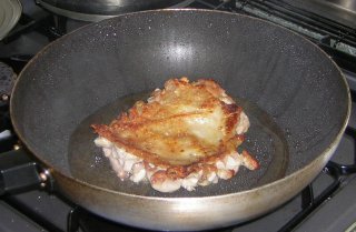 易くなる。 鳥モモ肉をサラダ油で焼く、先ず、皮の側からカリッとおいしく。ほんで、裏返して、身の方も焼く。 |