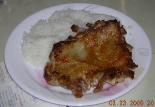 | 焼けたら、ご飯の横に「デーン」と乗せる。迫力にこだわらない なら、包丁で切ってから乗せても良い。 |