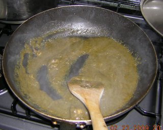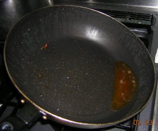 | フライパンにはチキンから出た香ばしく、おいしい脂が 残っている。これが命! |