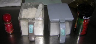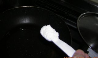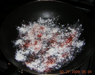 | 下味材料(小麦、カイエン、塩)をフライパンに投入。 (もちろん点火してません) |