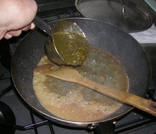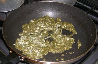 | 小麦粉が焦げないように、すぐさま、ホウレンソウソースを カップ1すくい取って。 |