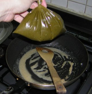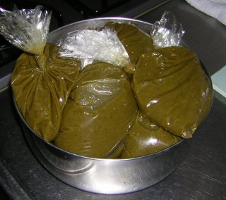 | 毎日火を入れていれば腐ることは無いだろうけど、繰り返す加熱で、折角の緑色が損なわれては悲しい。そこで、一回分づつ、ダイソーの保存袋(小)にいれて、ボールにいれて冷蔵庫に保存することにしました。 |