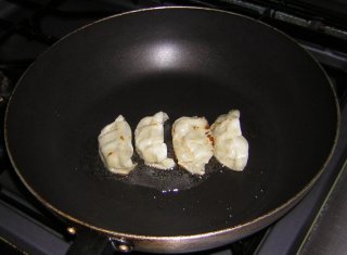 | 「あったので食べた」というだけの料理だが、何でもカレー に出来る実例の一つ。 油を敷いて、餃子を焼く(水を入れる) |