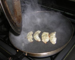 | お湯を入れて、蓋をし、ふっくらと蒸し焼きにしつつ、底面は カリッと焦げるように焼くとおいしい。 |