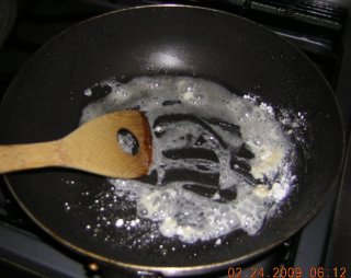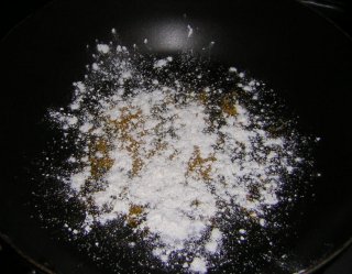 フライパンには餃子からでた、今ひとつ美味しそうじゃない脂が残っている。でも、捨てるのは惜しい。 残った脂の中に小麦粉を入れて、中火で加熱する。 |