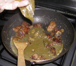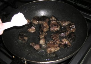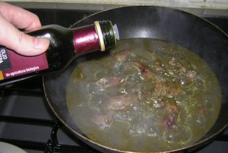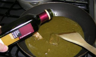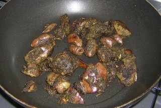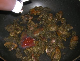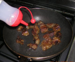 | 炒り煮にしたいので、フライパンに移動。レバーにはピリ辛が合うので、自作ハバネロオリーブ油を少々。 |