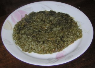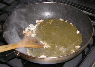 | ホウレンソウスープ、卵、をフライパンで和える。 |