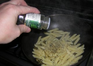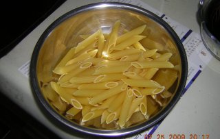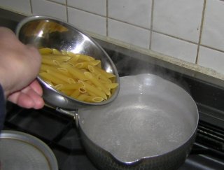 | ペンネの茹で上がりに一番時間がかかるので、まずは、ペンネを沸騰水に投入。(塩1つまみね) |