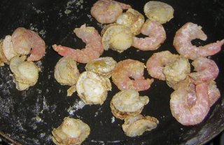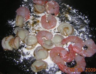 シーフード、行きまーす! 超手抜きの炒め方。まず、加熱していないフライパンに、 小麦粉、カレー粉、塩を適当にばら撒きます。 |