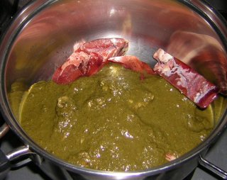 | ホウレンソウスープを加えます。あれ、一袋では足りないぞ。今回は二袋加えます。お、沢山出来そうだ。 |