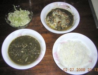 です。「もてなし」料理ではありません。 上に書いたレシピで、丁寧に料理すれば、ちゃんとした、レベルの高いホウレンソウカレーが作れるのは間違いありません。 しかし、以下に紹介する料理は「ちゃちゃっ」と作れて「すぐ食べられる」という「嫁さん旅行中のサラリーマンのお手軽料理」であることをご理解ください。いずれも、10分〜30分で作れるものです。 | |