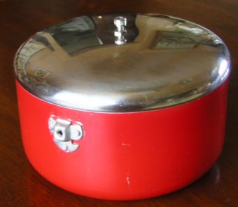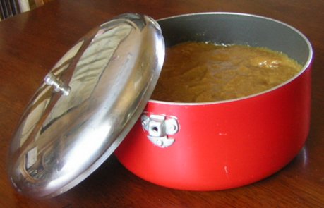 とはいえ、ちゃんとした旨いカレーになります。食べてみれば「あ、○○のカレーに似てる」と、お店の名前が浮かぶかもしれません。(好みの問題もありますから、わー不味!バカやロー!と思った人のために、予め十分に土下座をしておきました) 鶏モモ肉を2枚も奮発しているので一層旨いですが、給料前は安い胸肉で我慢します。もし、骨を取る面倒を厭わないのであれば、手羽元も美味しい部位です。手羽先は最も旨い部位の一つですが、残念ながら、骨が細かすぎて食べるのが難しくなります。 バター(最近のバターの高値には驚かされる)や牛肉など高価な材料を使わないので経済的です。市販のルーでも経済的にカレーが作れるのですが、やはり、安価な市販ルーは材料費を抑えているし、パッケージ代金や利益が入っているので、この「超お手軽・経済的・手作りチキンカレー」よりは少し割高で味も劣ります。(味のコントロールが出来ないしね) この調理プロセスでは鍋がポイントです。全体が金属で出来ていて、そのままオーブンに入れることができる(できれば)フタ付き鍋を使います。内部がテフロン加工されていれば、いっそう好都合です。もし、そんな鍋が無ければ、洗い物が一つ増えますが、鍋の中身をキャセロールかステンレスボールに入れて、オーブンに入れれば可能です。(でも、洗い物が増えるのは嫌でしょ:本音) 下の写真の鍋は、フッ素加工の深鍋から、プラスティックの柄を外して、オーブンに入れられるようにしたものです。ふたのつまみも、金属のねじに交換しています。(ここまでしなくても、130度なら耐えると思いますが…)厚いときは、オーブン用のミトンを両手にはめて取り扱います。 |