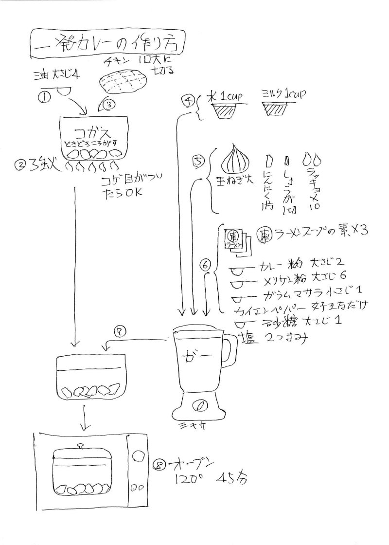- ミキサーにヒガシマルラーメンスープの元×3、カレー粉大さじ2、メリケン粉大さじ6、ガラムマサラ小さじ1、カイエンペパーすきなだけ、砂糖大さじ1、塩2つまみ、を加えて攪拌する