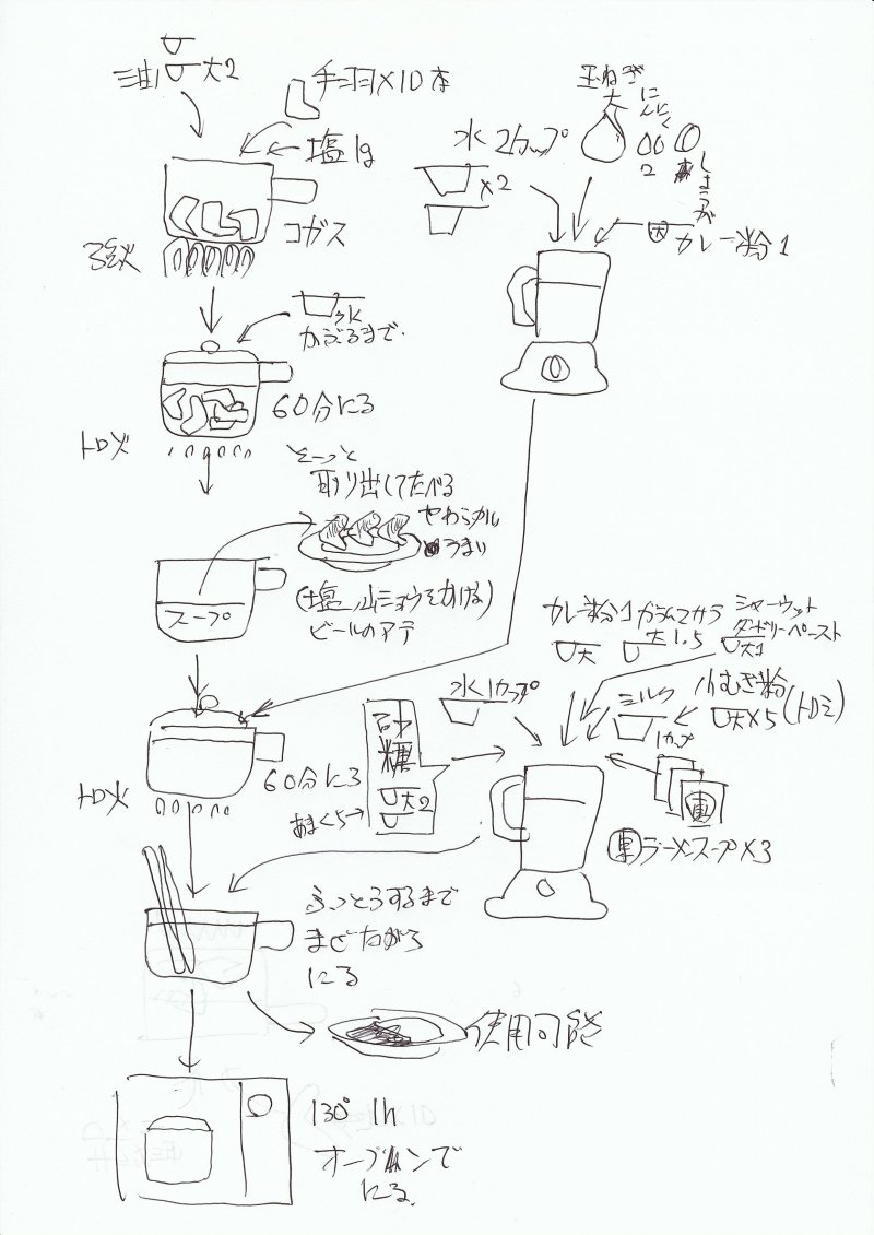 - 玉葱臭さを緩和するために、とろ火で60分煮込む。ここでは、焦げ付く