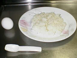 卵一個、ご飯一膳分(皿に盛って準備する)、塩0.8g、サラダ油5ml、を準備します。なんと、これで、全部です。 写真には、サラダ油は写っていません。 体には悪いですが、塩は少ないとおいしくありません。 |