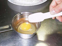 卵に塩加えて、解きほぐします。解き加減は問いません。少なくとも、塩が分散する程度には、解きます。 |