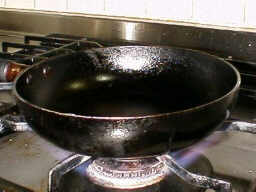 小さなフライパン(テフロンで無いやつ)を煙が出るまで強火で轟々と加熱します。 写真で利用しているのは、昔テフロン加工されていたが、それが、剥げ落ちたアルミのフライパンです。 |