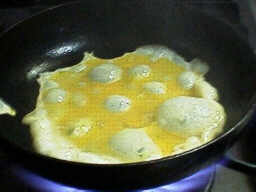 ここからは、手早く作業します。 サラダ油をフライパンに流し、傾けて全体に行き渡らせた後、解きほぐした卵を入れます。 |