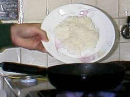 卵を入れて、3秒後、(まだ、卵は半分が生です)フライパンの上で、お皿をクルッと裏返して、卵の上にご飯を乗せるようにして、加えます。 |
