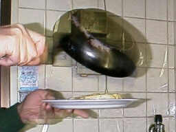 非常に短時間作れ、材料も安価です。もちろん、主観の問題ではありますが、かなり旨いので、我が家では人気メニューです。 「こんなものが、旨いはずは無い」そう思われるかも知れませんが、何と、おいしいのです。 NEWONの総統閣下に献上して、「旨い」とのお言葉を頂戴した事もある、由緒正しい料理です。 この料理は、我が家では「ペシ」と呼ばれています。それは、昔、フライパンに、ご飯を加えたあとで、軽量カップの底で、「ペシペシ」とご飯を平らに延ばしていたからです。 しかし、この作り方では、卵のうまみを損ねるので、今日では、あらかじめ、平らに皿に盛ったご飯を入れる方法に改良されています。 |
