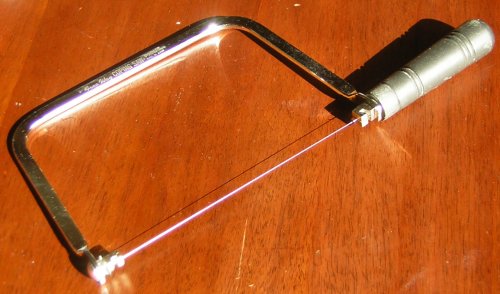| 卵を切る道具も作ってみました。糸鋸の歯の代わりに、0.2mmのステンレス線(予め延伸しておく)をピンと張ったものです。面白いようにゆで卵が切れます。 |